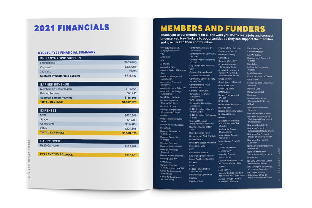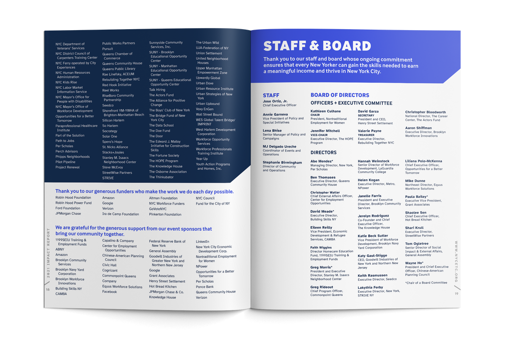 New York City Employment and Training Coalition is a nonprofit working to ensure that every New Yorker — especially those who have been historically marginalized and disenfranchised and cut off from workforce opportunities — has access to the skills, training, and education needed to thrive in the local economy, and that every business is able to maintain a highly skilled workforce. Working hand in hand with leaders from the organization, our team created a print and web report to inform supporters about the successful year NYCETC had and encourage future donations.